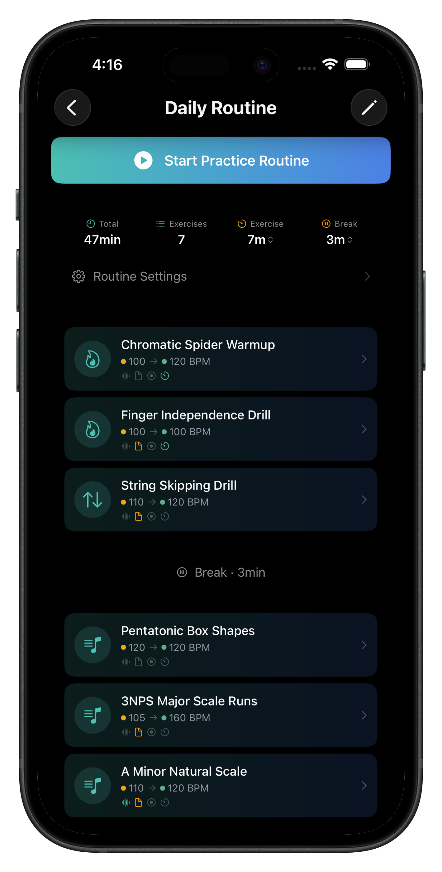Build guitar practice routines from your exercise library. Attach backing tracks, tabs, and focus reminders.
